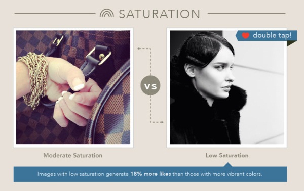Also, Pinterest images with fifty percent saturation or more received ten times the number of repins than desaturated images, while Instagram images with low saturation earned more Likes.