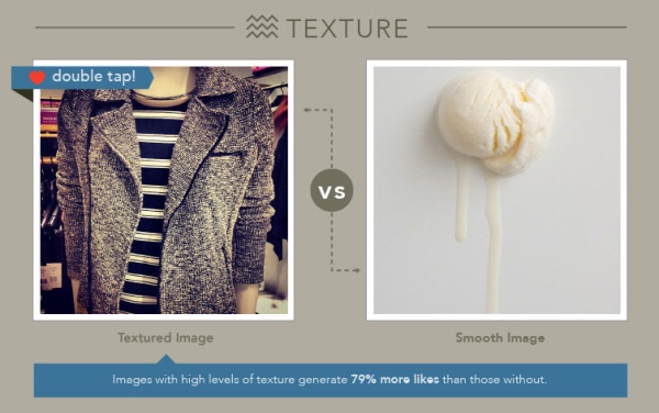 Other image features impacting whether or not an Instagram image received a Like included background and texture, with images that had a high amount of background winning twenty nine percent more likes than those without backgrounds. Images with texture won seventy nine percent more likes. Likes on Instagram, while incredibly valuable, are hard to come by with sixty five percent of Instagram images garnering between zero and ten likes.