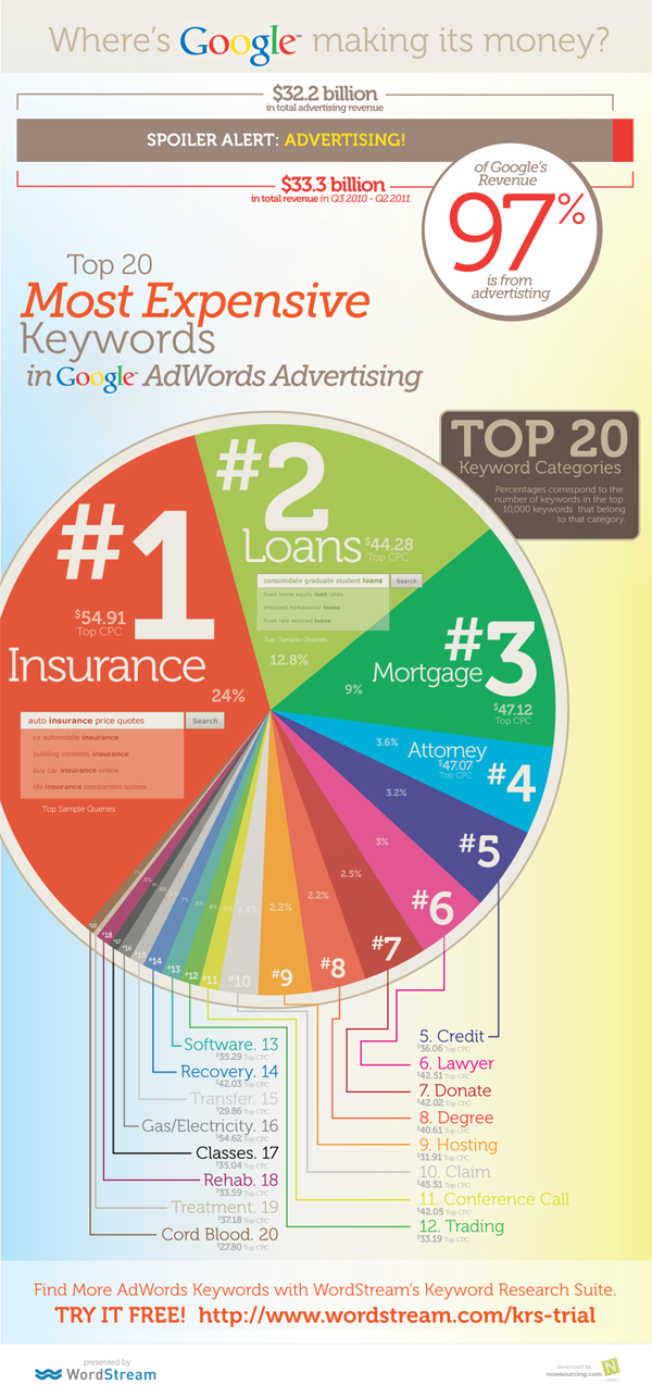 Search marketing software provider WordStream has released data showing the top 20 high-volume keyword categories with the highest costs-per-click at Google. According to WordStream, the top five keyword categories are Insurance, Loans, Mortgage, Attorney and Credit (see the infographic below for more). Advertising accounts for approximately 97% of Google’s revenue. The keyword categories with the highest volumes and costs represent businesses with very high lifetime customer value – in other words, these industries can afford to pay lot to acquire a new customer. These businesses include lawsuits, mortgage applications, and server hosting. Some high-volume keyword categories have lower CPCs because advertisers have slimmer margins to expend on PPC advertising. WordStream compiled data from its keyword database and the Google Keyword Tool to determine the top 10,000 most expensive English-language keywords over a 90-day period. This keyword list was then organized into categories by theme. The largest keyword categories were determined by weighting the number of keywords within each category, as well as the estimated monthly search volume and average cost per click for each keyword.