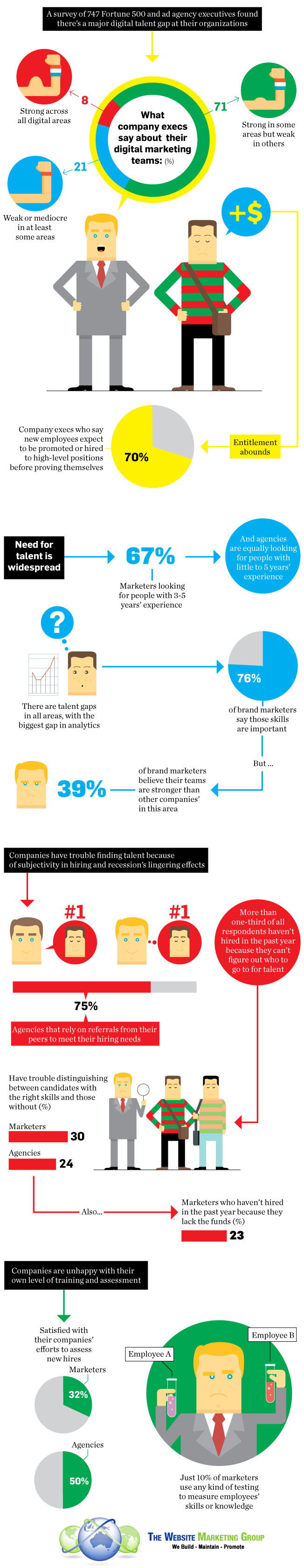 In the following infographic, we illustrate a survey from almost 750 Fortune 500 and ad agency execs. The result is unexpected: there is a relatively huge gap between the digital marketing expertise needed by organisations and the talent actually available to them at every level. Across brands and agencies alike, there is an insufficient amount of grooming talent, training and formally assessing skills. That might seem to spell a great opportunity for recent college grads looking for work. However, you need to think further, as almost three-fourths of respondents say young hires suffer from an inflated sense of entitlement.