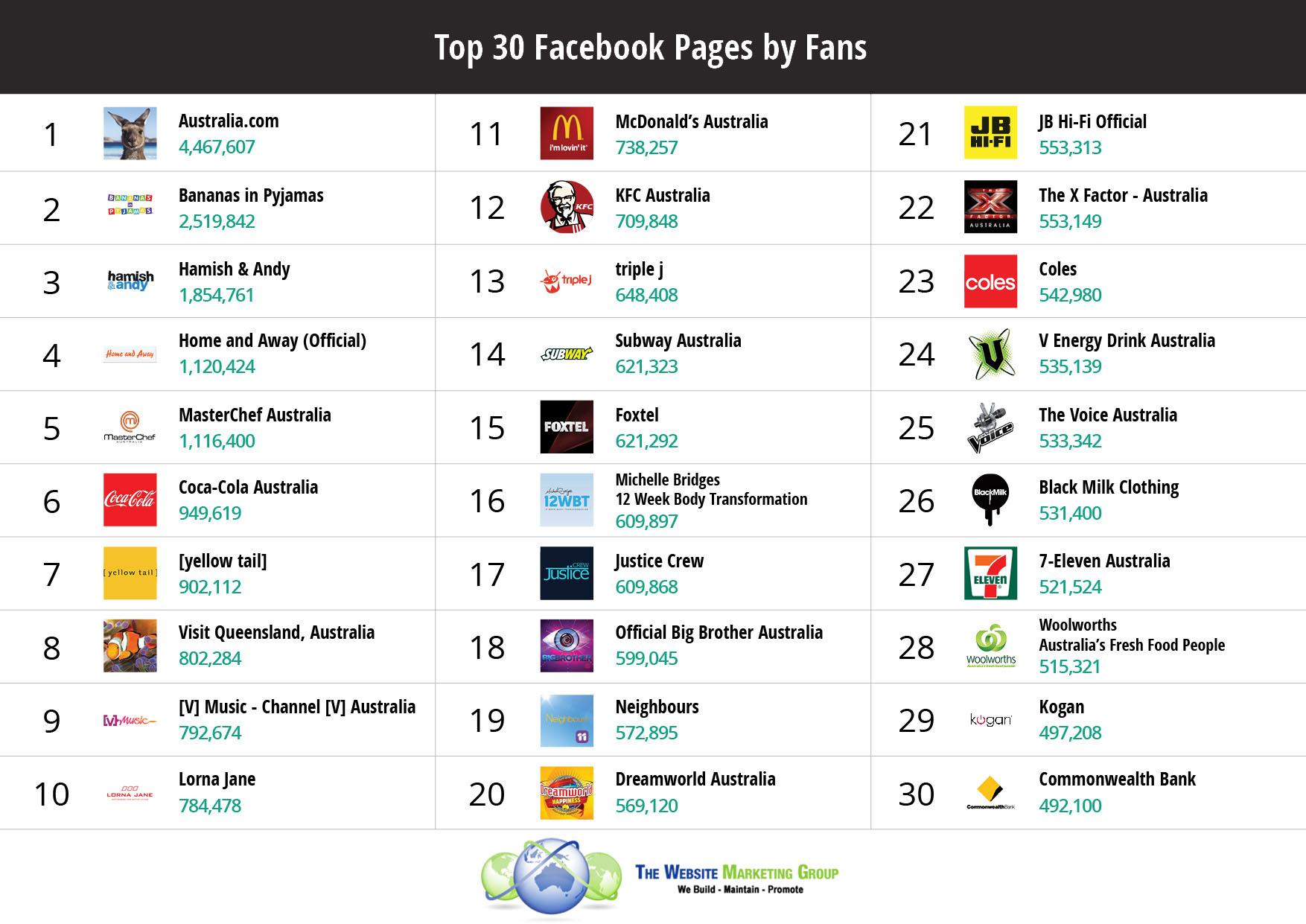 As one of the most popular social media site in the world, it’s no surprise that Facebook becomes the main aim of the majority of brands to build their presence on it. With more than half of Australia’s population actively a part of Facebook, naturally Facebook plays an important role for brands, whether they are local or international. In today’s post, The Website Marketing Group Blog team will share the top 30 Facebook Pages that are the most popular in Australia, based on the very number of Australian users that like them.